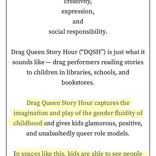 A gay nightclub in Minnesota held a drag show for children earlier this month. One of the performers said in an interview “I want to give the kids an opportunity to see what drag queen/king life is like on a day to day basis.” fox21online.com/2022/05/13/cof…